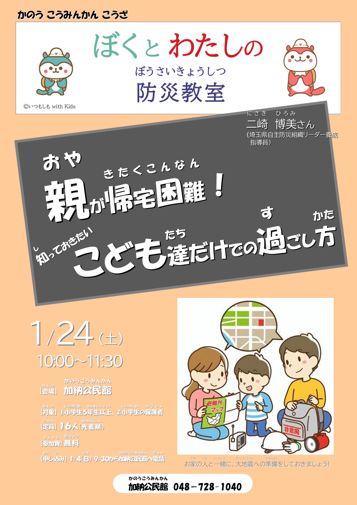 小学生5年生以上の方、小学生の保護者の方々に向け 埼玉県自主防災組織リーダー養成指導員の資格をお持ちの 二崎博美さん に講演していただきます。