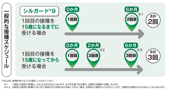 小学6年生~高校1年生相当の女子 ワクチンの種類:9価HPV(商品名:シルガード) 【1回目を14歳以下で接種する場合:2回接種が可能】 ※14歳以下で接種を開始した場合、2回接種で終了できる接種が可能です。3回接種と比較して、有効性などが劣らないとされています。 【1回目を15歳以上で接種する場合:3回接種】 接種回数・接種間隔については ※小学6年生~高校1年生の接種に関する厚生労働省リーフレットはこちら ※高校1年生相当(平成22年度生まれの女性)の方は定期接種最終年度にあたります。 |