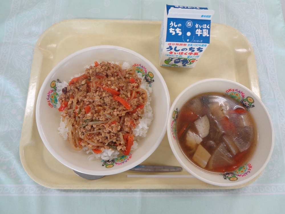 - 当日の献立 挽肉ともやしのあんかけ丼、いも煮汁、牛乳
