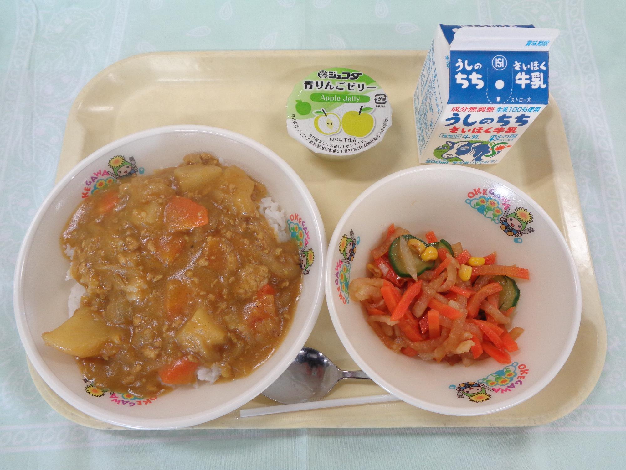 - 当日の献立 カレーライス(豆乳)、大根サラダ、セレクトデザート、牛乳