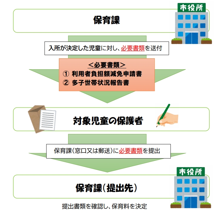 - 対象児童のうち入所が決定した児童に対し、保育課から必要書類を送付します。対象児童の保護者の方は、必要書類を保育課に提出してください。