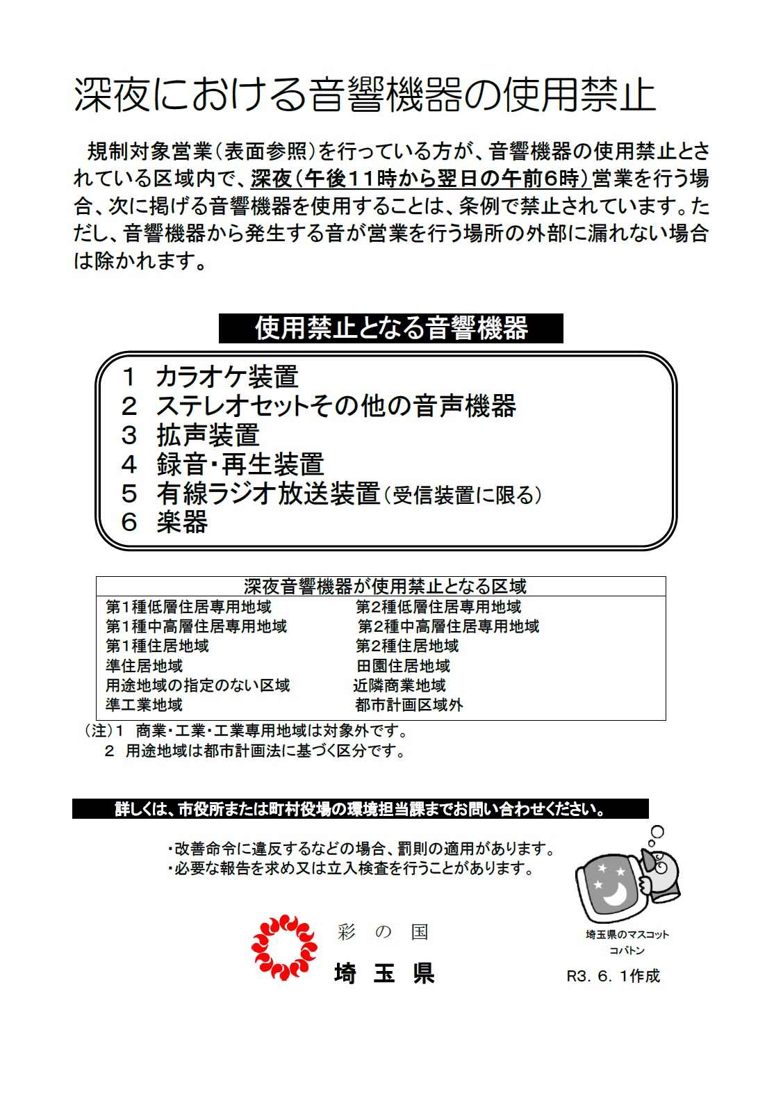 埼玉県生活環境保全条例により、上記の規制対象となる営業を行っている方が、音響機器が使用禁止とされている区域内で深夜(夜11時~翌日午前6時)に営業を行う場合、カラオケ等の音響機器を使用することは禁止されています。