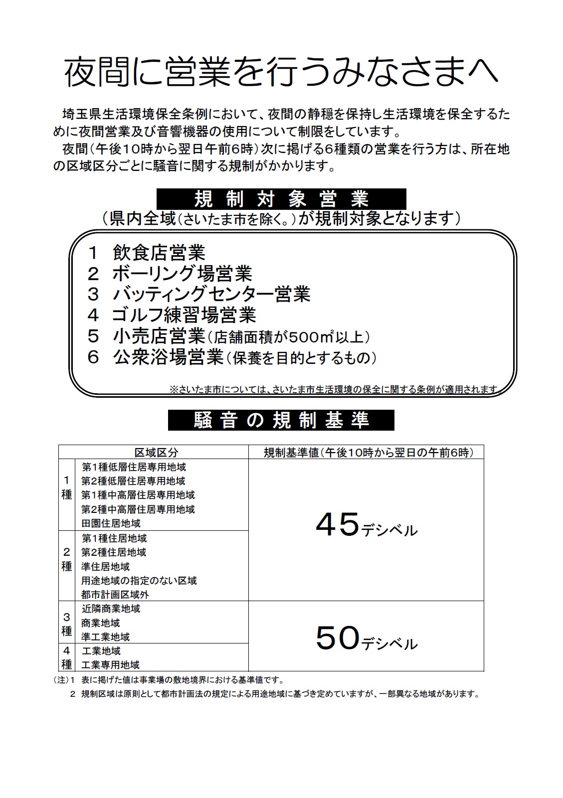 埼玉県生活環境保全条例により、夜間(午後10時~翌日午前6時)に、次に掲げる6種類の営業を行う方は、営業をする店舗が所在する区域区分ごとに騒音に関する規制がかかります。