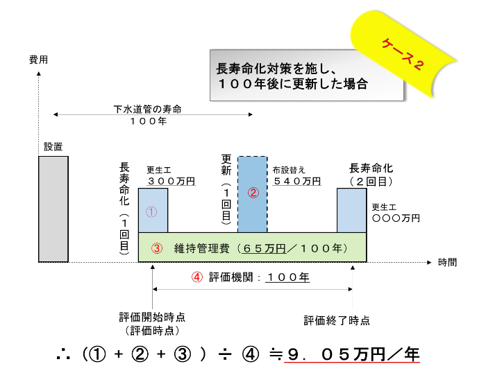 この場合、ケース1よりもケース2のほうが安価となることから、ケース2(長寿命化対策)を行います。