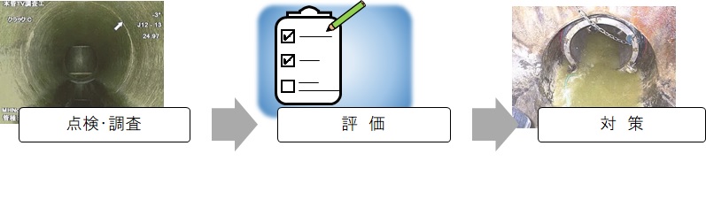 事故の防止とライフサイクルコスト(設置、維持管理、更新、長寿命化対策、処分などにかかる費用の総計)の低減を考慮した計画的な工事を実施するため、下水道ストックマネジメント計画を策定します。そのために下水道施設の点検・調査を実施し、劣化状況等から評価を行い、対策を判断します。更新と長寿命化対策のどちらで行うかは、現場条件や経済比較等から総合的に評価をして、対策を決定します。