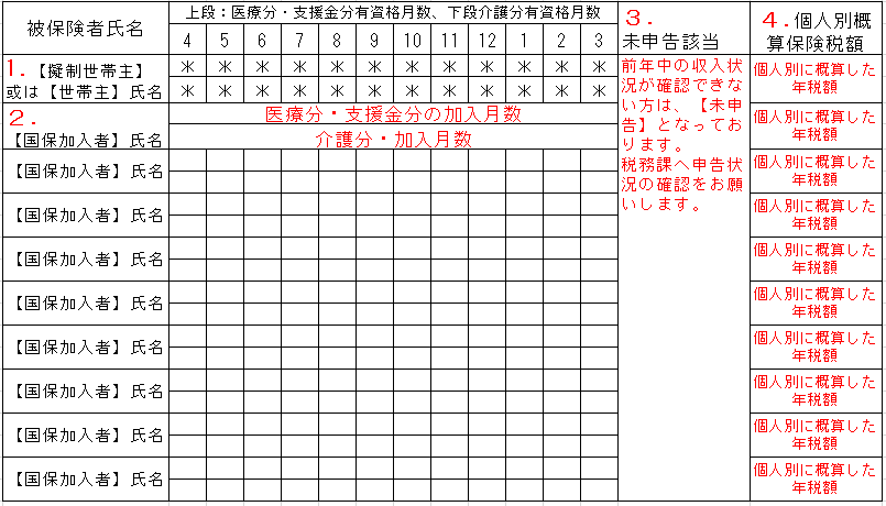 国民健康保険に加入している者の氏名が印字されます。国保加入者は、加入該当月に「*」の印字がされます。