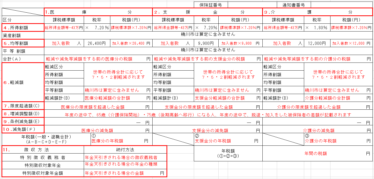国民健康保険税は、医療分・後期高齢者支援金分・介護分のそれぞれにおいて課税限度額が設けられてます。所得割と均等割額を合算した額が、課税限度額を超えた場合は、限度超過額欄にその金額が印字されます。