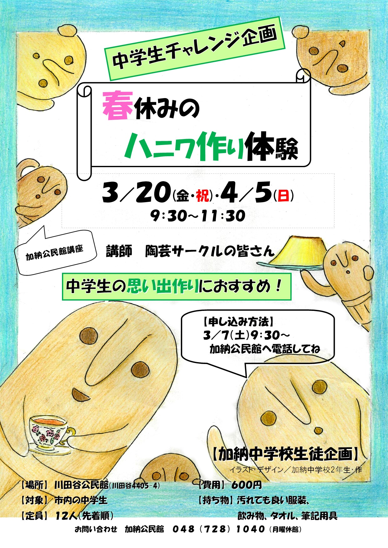 - 加納公民館講座「中学生チャレンジ企画 春休みハニワ作り体験」