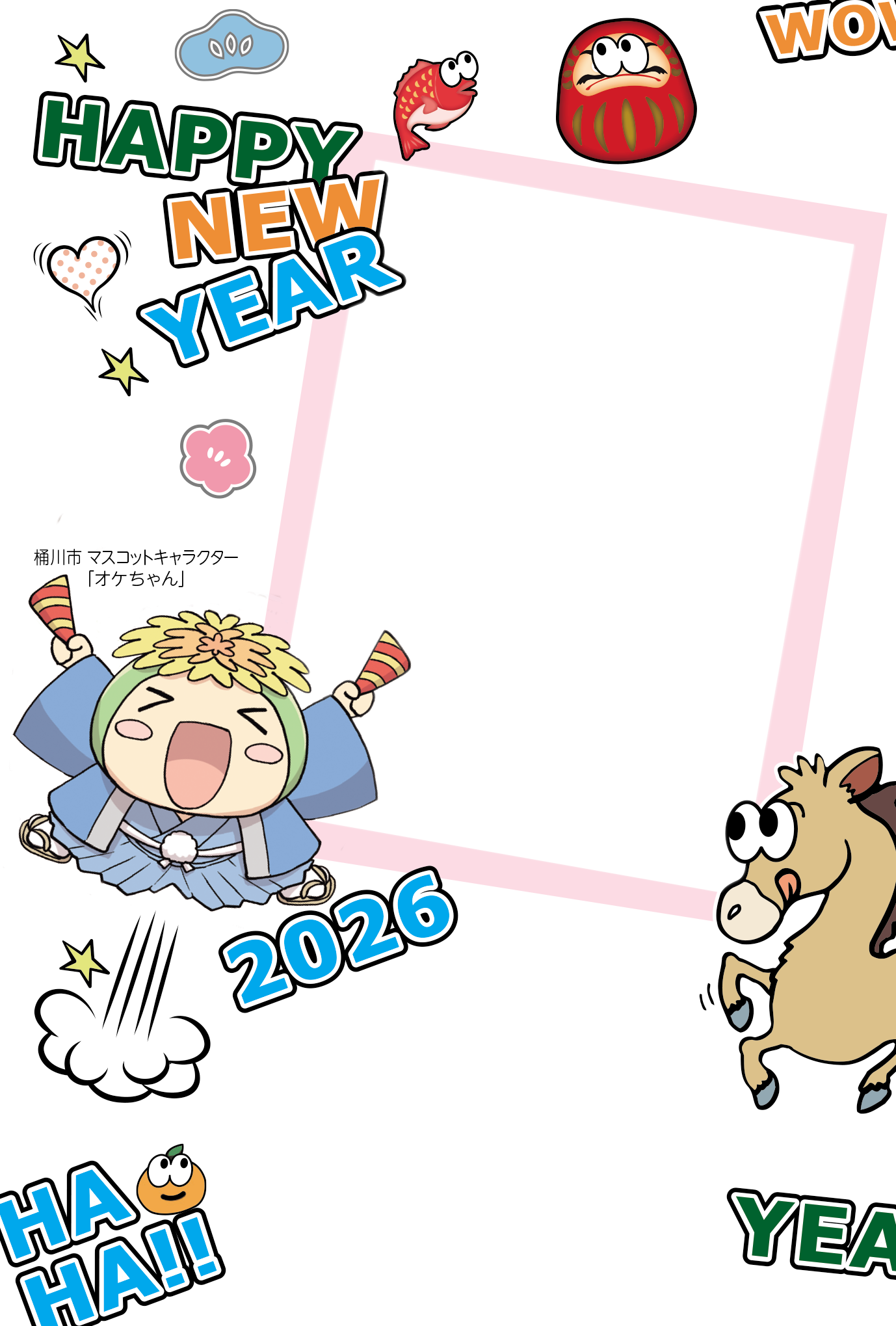 オケちゃんの年賀はがきに関する知的財産権は、桶川市と桶川市観光協会に帰属します。法律によって認められる範囲を超えた使用はできません。