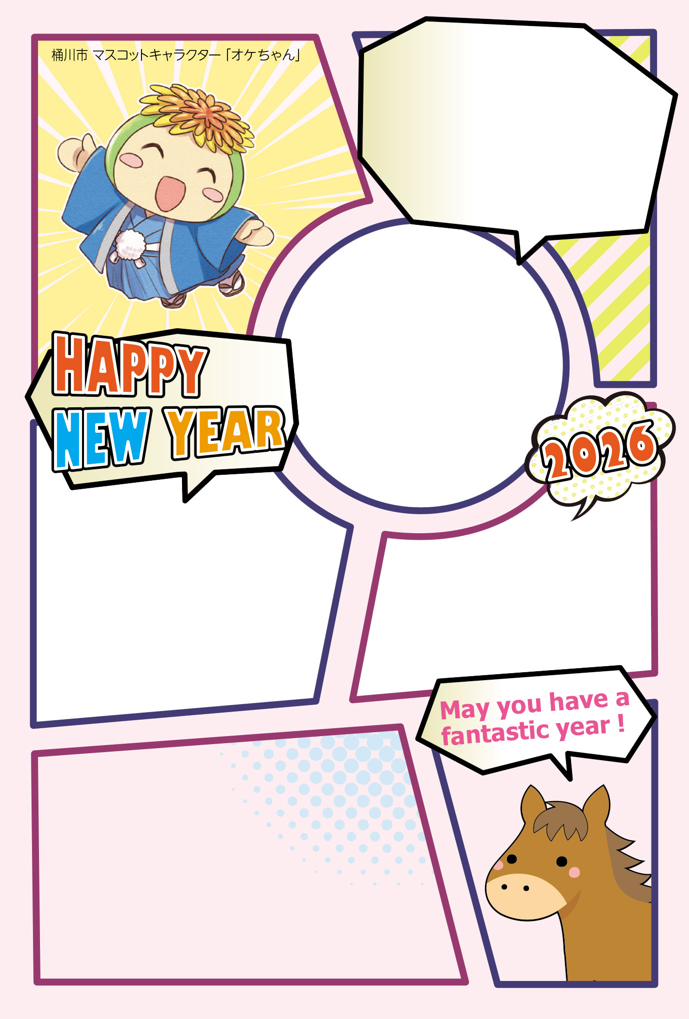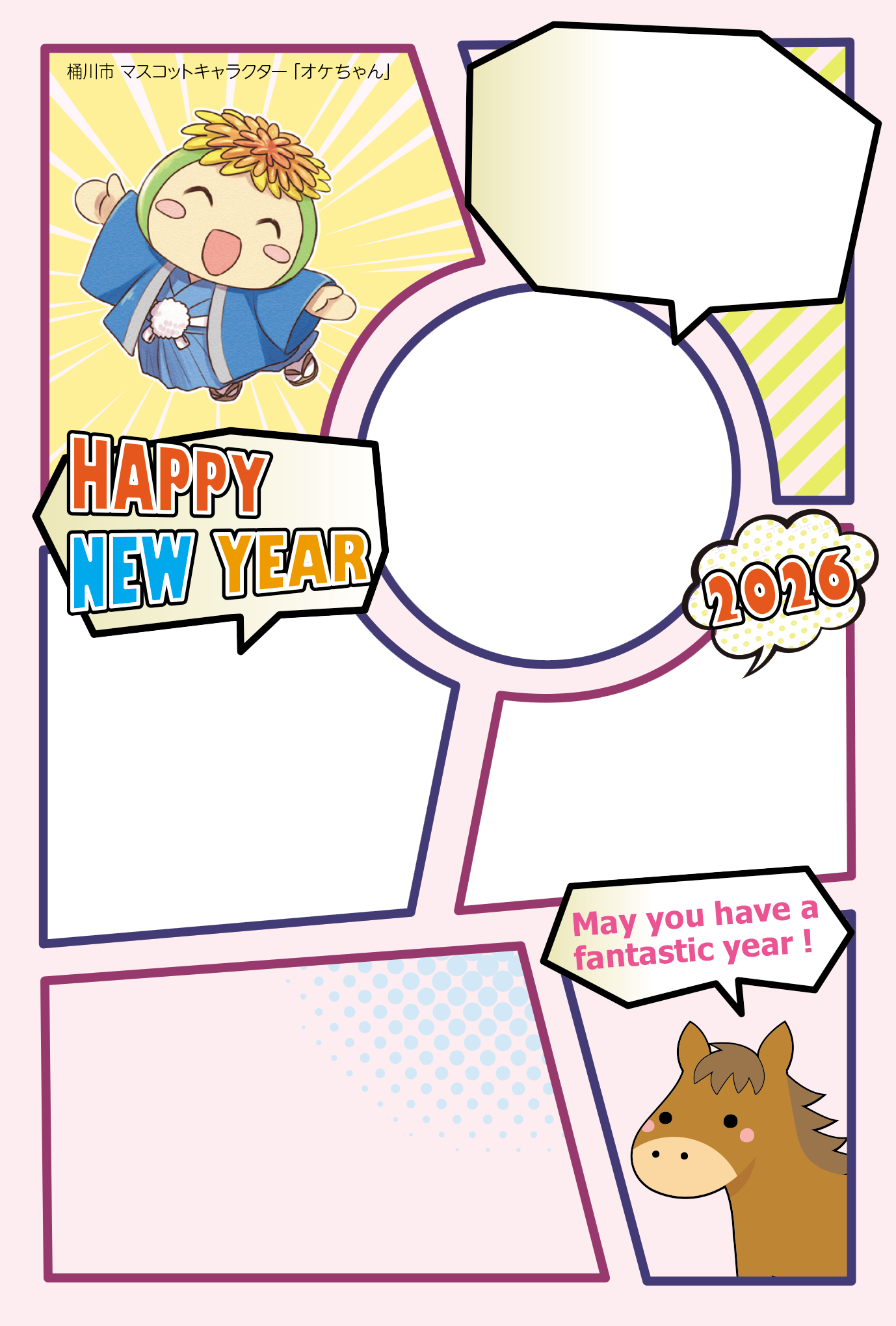 広報おけがわ令和7年12月号に中綴じした「オケちゃん年賀はがき」の印刷用データは、このページからダウンロードできます。
